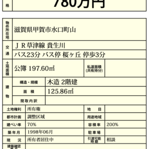 【中古戸建】甲賀市⽔⼝町⼭ 780万円